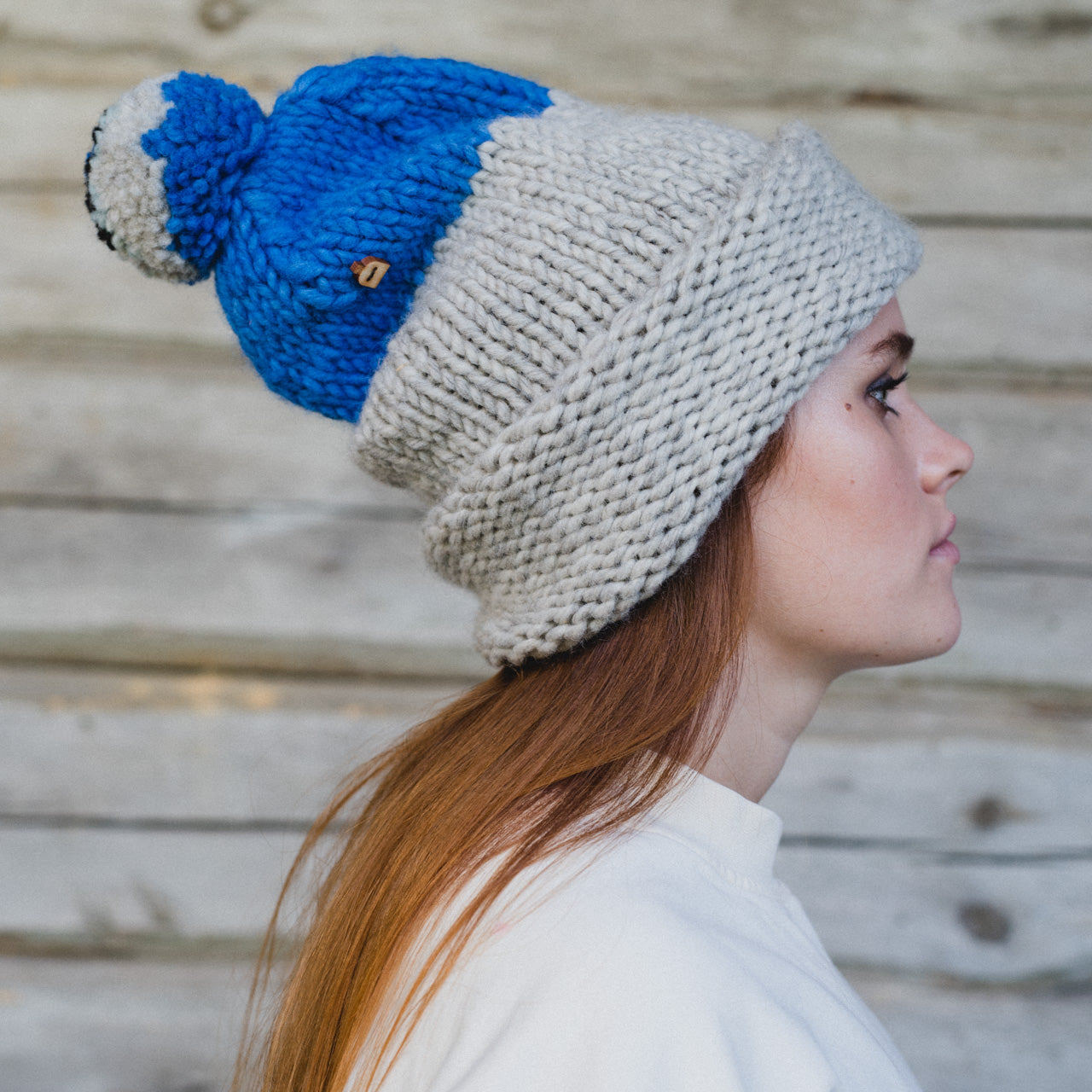 Tämä vaaleanharmaa ja sähkönsininen Sinerrys Myssy on neulottu käsin maailman Myssypääkaupungissa Pöytyällä Myssymummojen puikoissa 100% suomenlampaan villasta. Myssyä koristaa muhkea tupsu.