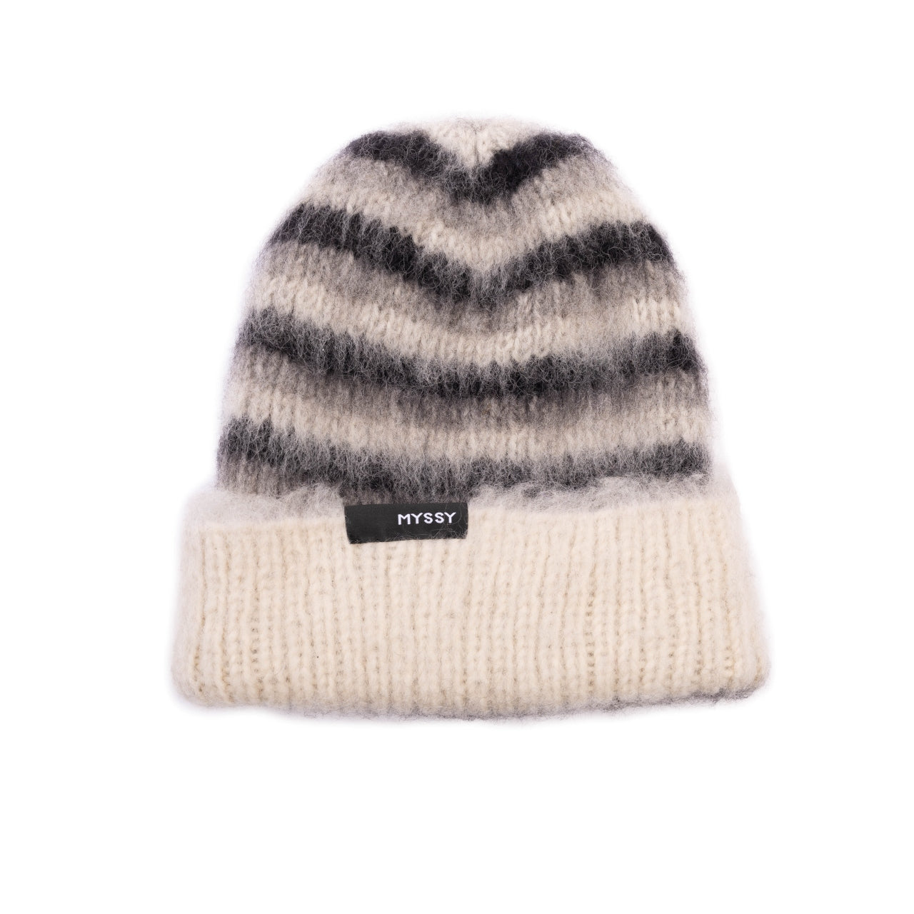 Tämä raidallinen Talvi Värinä-myssy on neulottu käsin maailman Myssypääkaupungissa Pöytyällä Myssymummojen puikoissa 100% suomenlampaan villasta ja karstattu perinteisin menetelmin kirkonkylällä. Karstaus antaa sille erityisen pörheän pinnan ja uskomattoman ylellisen pehmeyden. Pohjaväri on luonnonvalkoinen ja raidoissa on harmaata ja mustaa.