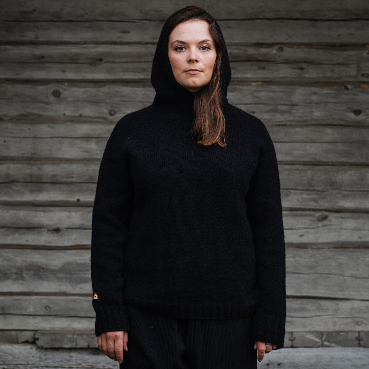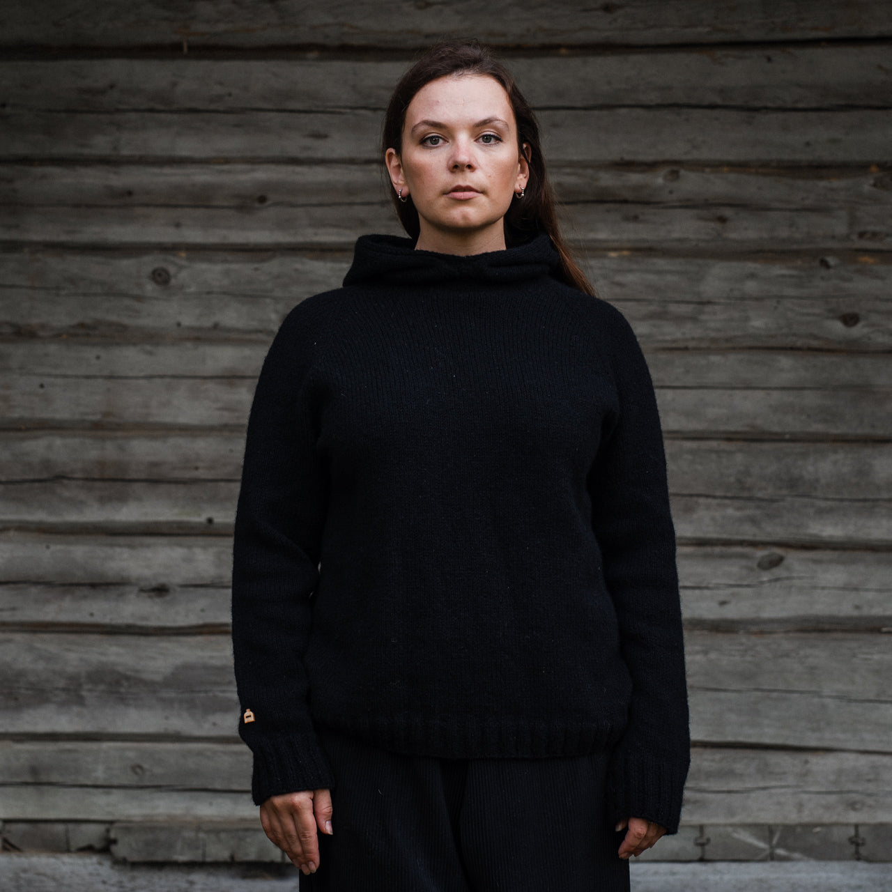 Tämä musta Noki Myssy Hoodie -huppari on neulottu käsin maailman Myssypääkaupungissa Pöytyällä Myssymummojen puikoissa 100% suomenlampaan villasta.