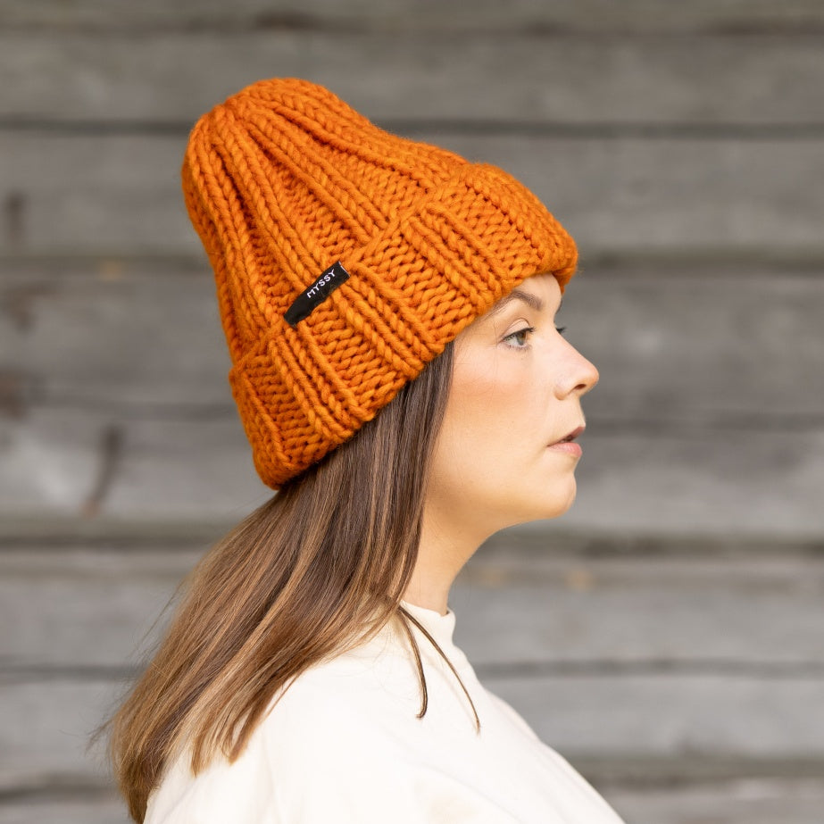 Tämä oranssi Muffi on neulottu käsin maailman Myssypääkaupungissa Pöytyällä Myssymummojen puikoissa 100% suomenlampaan villasta. Tuote on käsinvärjätty ja värjäysprosessin vuoksi väreissä saattaa esiintyä pientä eräkohtaista vaihtelua.