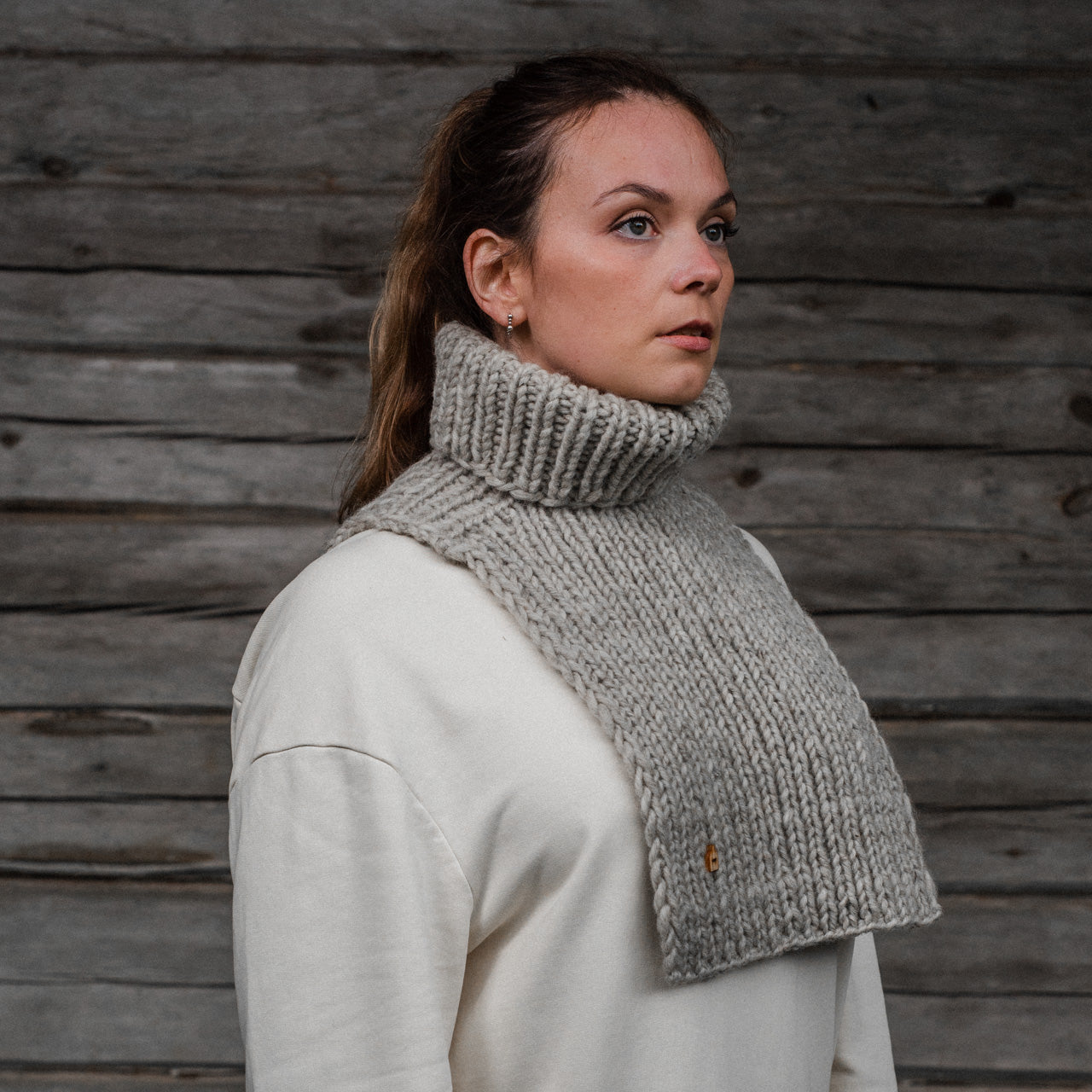 Tämä vaaleanharmaa Jäkälä Myssy-kauluri on neulottu käsin maailman Myssypääkaupungissa Pöytyällä Myssymummojen puikoissa 100% suomenlampaan villasta. Tuote on värjäämätöntä villaa, sävy muodostuu kun kehrätessä sekoitetaan erivärisiä villoja.