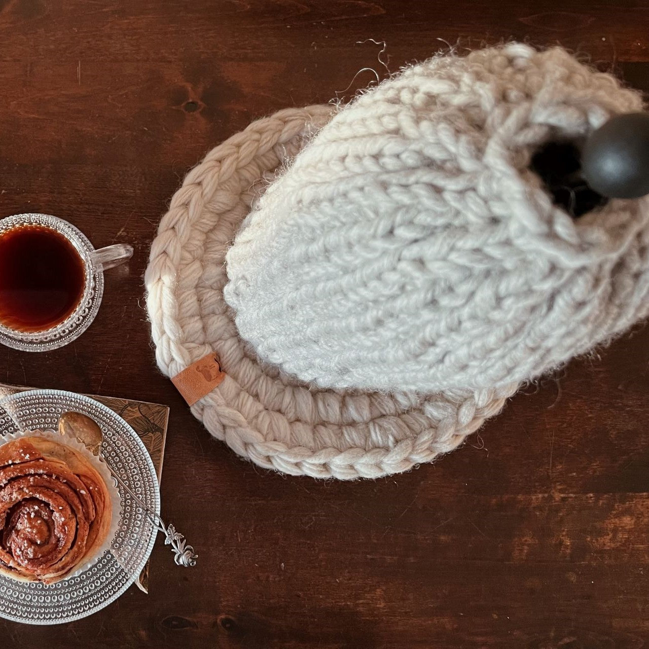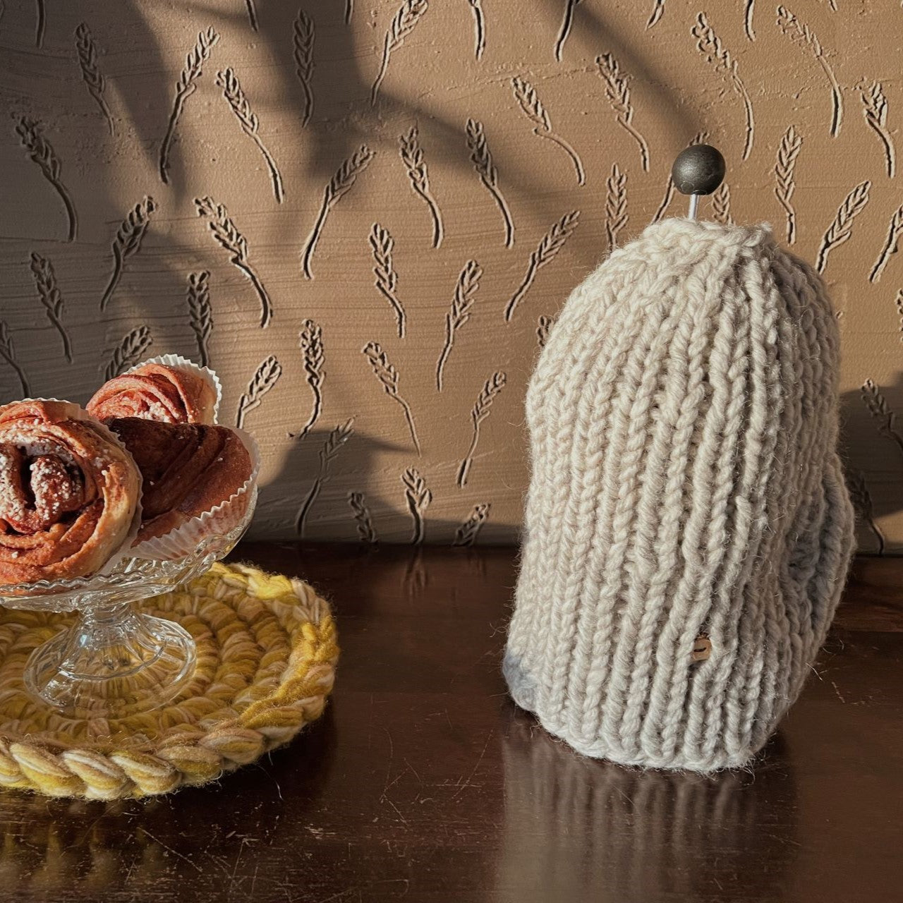 Markkinoiden ainoa ja ensimmäinen Pannu Myssy eli presso-pannumyssy on ollut testikäytössä farmilla vasta 14 vuotta, mutta koska se edelleen pitää paitsi muotonsa myös lämmön loistavasti, on aika kattaa se esille kaikkien Myssy-ystävien saataville. Pressopannun kahvi on ihanan täyteläistä, tämän vuosituhannen pannukahvia. Ja pannusta puheenollen kyllä tämä pannumyssy sopii yhtä pitkällä kokemuksella myös tee- tai kahvipannuun, josta nokka tulee ulos silmukoiden välistä.