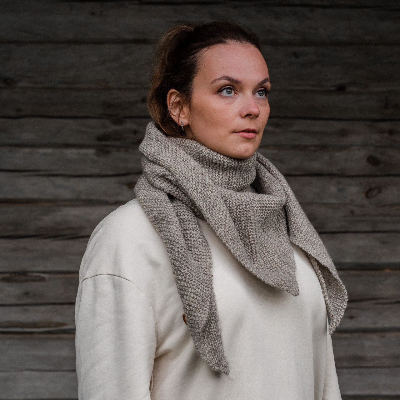 Tämä vaaleanharmaa Jäkälä Myssy Wrap -huivi on neulottu käsin maailman Myssypääkaupungissa Pöytyällä Myssymummojen puikoissa 100% suomenlampaan villasta. Tuote on värjäämätöntä villaa, sävy muodostuu kun kehrätessä sekoitetaan erivärisiä villoja.