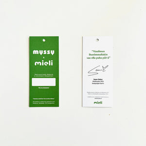 Paha Päivä -paita on Mielinauha-kampanjaan suunniteltu ja musiikin inspiroima uusi Myssy-tuote. Paita kantaa Samu Haberin uuden kappaleen nimeä ja on Myssyfarmille kokonaan uusi avaus käsityötaidon saralla: Suomalaisen yrityksen portugalilaisella tehtaalla valmistetut laadukkaat luomupuuvillaiset paidat ovat Myssymummojen suomenlampaan villalla käsinkirjailemat. Paha Päivä -paitaan liittyy ajatus avoimuudesta, empatiasta ja toisen kunnioittamisesta. Ulkopuolinen ei koskaan voi tietää, mitä julkisivun taakse kätkeytyy. Tätä paitaa voit käyttää niin hyvänä kuin pahana hetkenä muistuttamaan lohdusta - armollisuudesta muita ja itseään kohtaan.