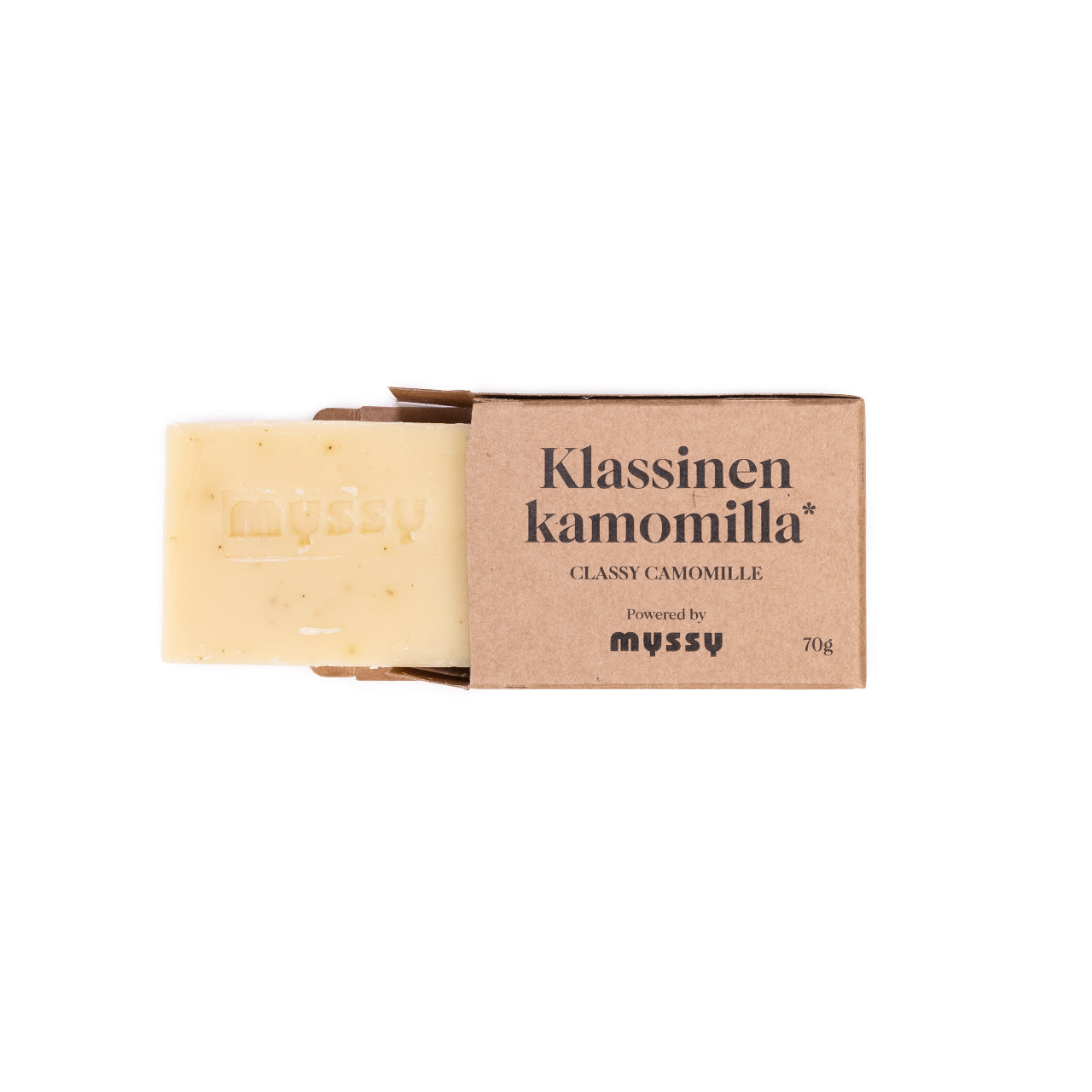 Ainesosat: kookosöljy (sodium cocoate), oliiviöljy (sodium olivate), vesi (aqua), auringonkukkaöljy (sodium sunflowerate), glyseroli (glycerin), rypsiöljy (sodium rapeseedate), risiiniöljy(sodium castorate), kuivattu kamomillankukka(Matricaria recutita flower flour), uutettu kamomilla (Matricaria recutita flower extract).