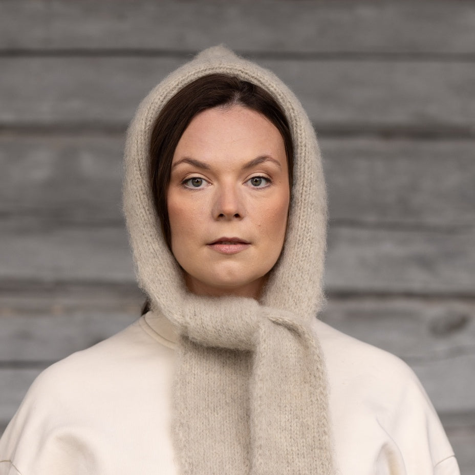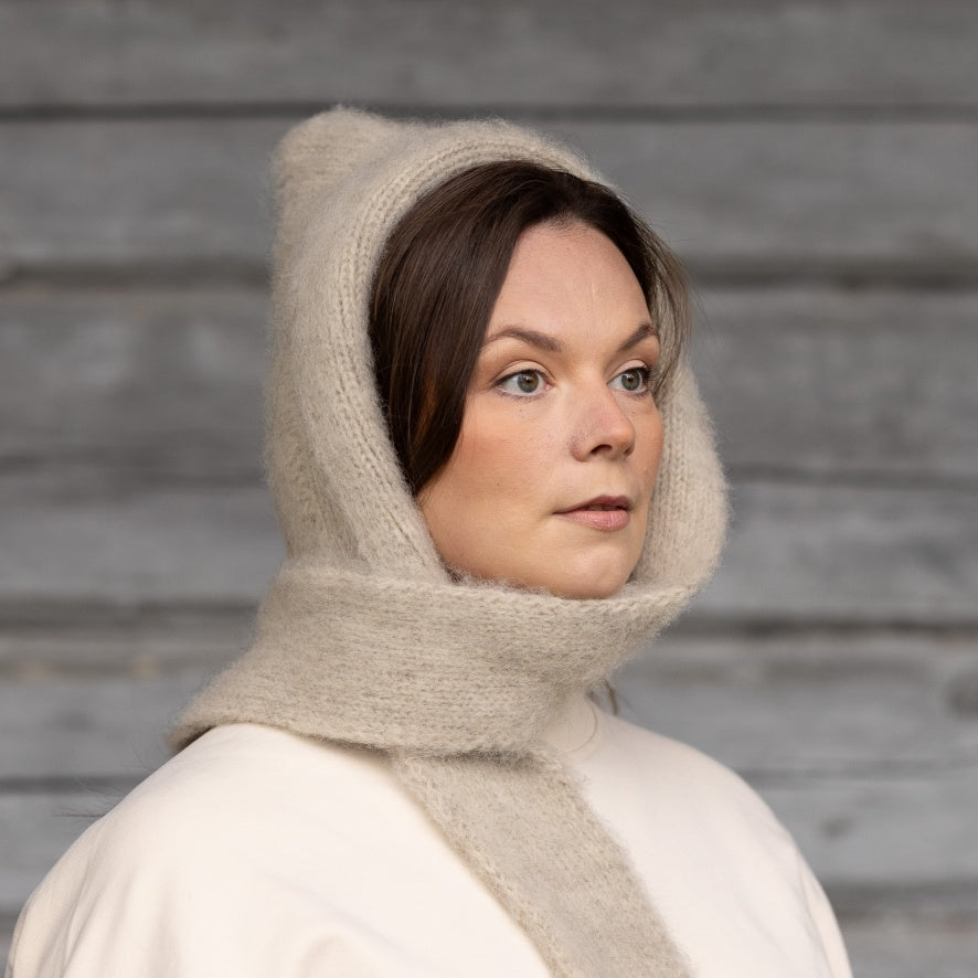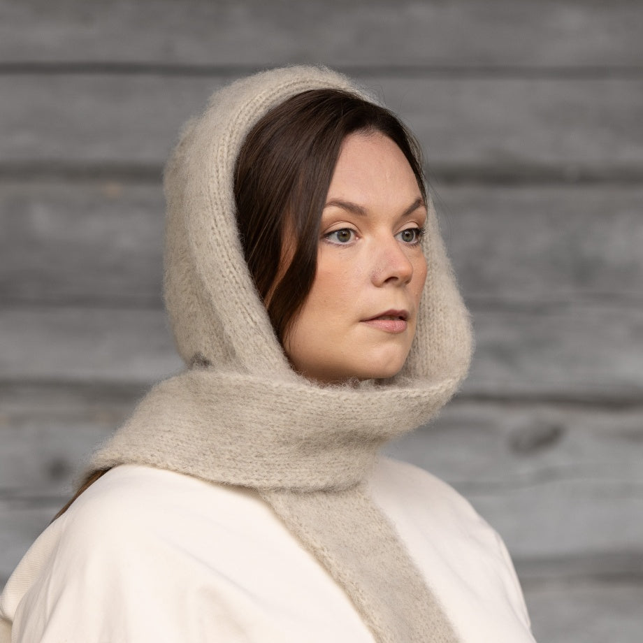 This natural light grey Haave Hood is hand-knitted by Myssy Grannies in Pöytyä Finland from 100% Finnsheep wool. The yarn is natural colored. Its soft Finnsheep wool surface has been carded with traditional methods here in Pöytyä.