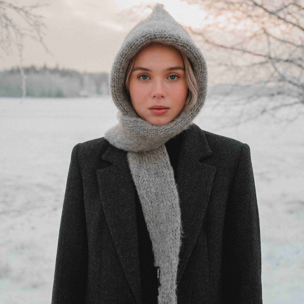This natural stone grey Haave Hood is hand-knitted by Myssy Grannies in Pöytyä Finland from 100% Finnsheep wool. The yarn is natural colored. Its soft Finnsheep wool surface has been carded with traditional methods here in Pöytyä.