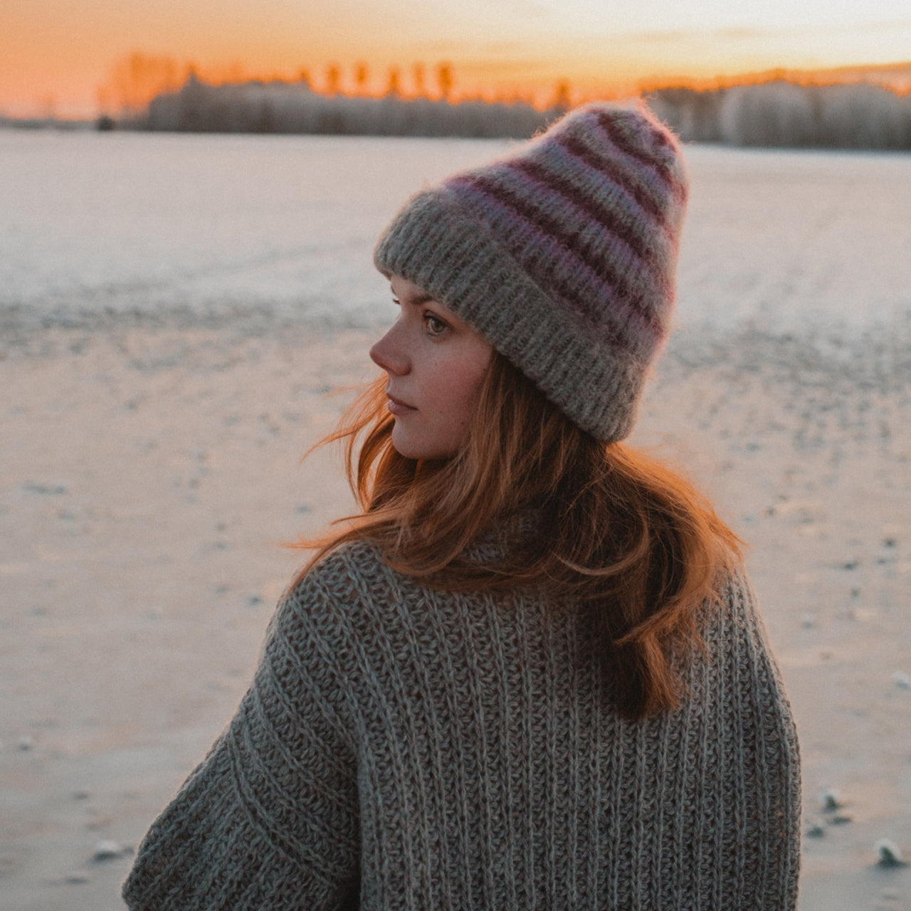 This stripy Syksy Värinä Myssy beanie has been hand-knitted and hand-carded with traditional methods here in Pöytyä to give a special soft atmosphere and sophisticated form. This beanie can be traced all the way back to the carding machine, Granny that made it, spinnery that produced the yarn and sheep farm that provided the wool. There is a natural grey base with grey, lavender and plum stripes.