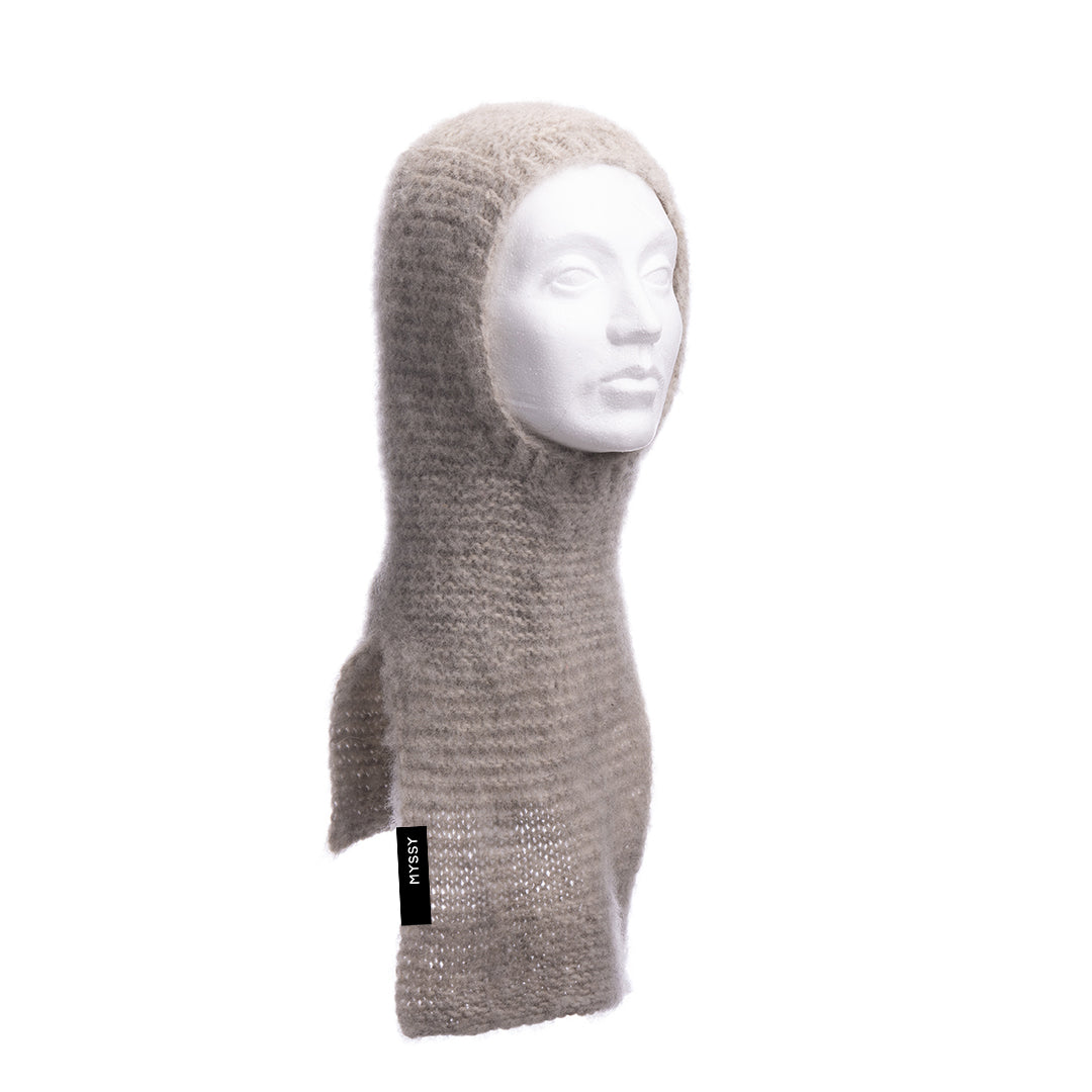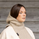 This natural light grey Jäkälä Halla Hood is hand-knitted by Myssy Grannies in Pöytyä Finland from 100% Finnsheep wool. The yarn is natural colored. Its soft Finnsheep wool surface has been carded with traditional methods here in Pöytyä to give a special soft atmosphere and sophisticated form.