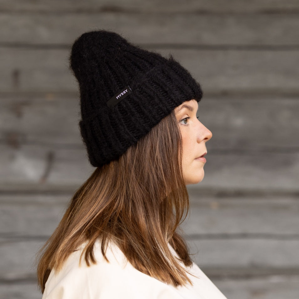 This black Kyrö Original beanie is hand-knitted by Myssy Grannies in Pöytyä Finland from 100% Finnsheep wool. The yarn is hand-dyed and due to the dyeing process there may be a slight variation in the colors.