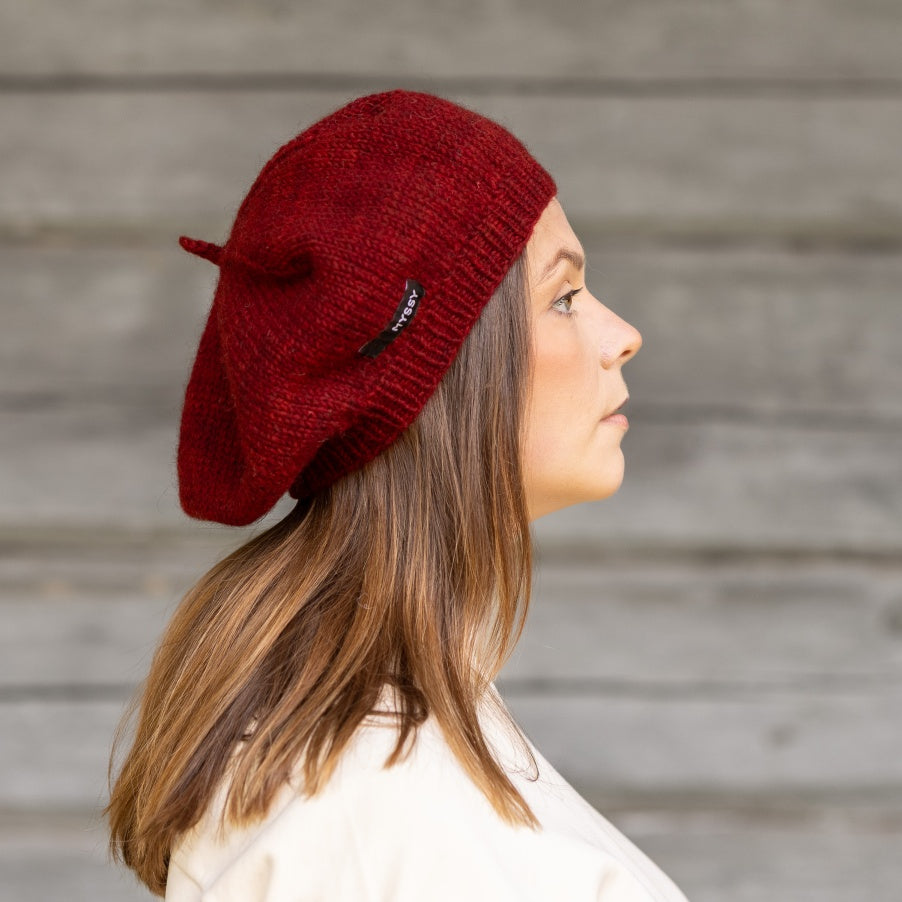 This lingonberry red Tampere Myssy Beret is hand-knitted by Myssy Grannies in Pöytyä Finland from 100% Finnsheep wool. Tampere Beret is hand-dyed and due to the dyeing process there may be a slight variation in the colors.