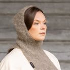 This natural grey Kallio Halla Hood is hand-knitted by Myssy Grannies in Pöytyä Finland from 100% Finnsheep wool. The yarn is natural colored. Its soft Finnsheep wool surface has been brushed with traditional methods here in Pöytyä to give a special soft atmosphere and sophisticated form.