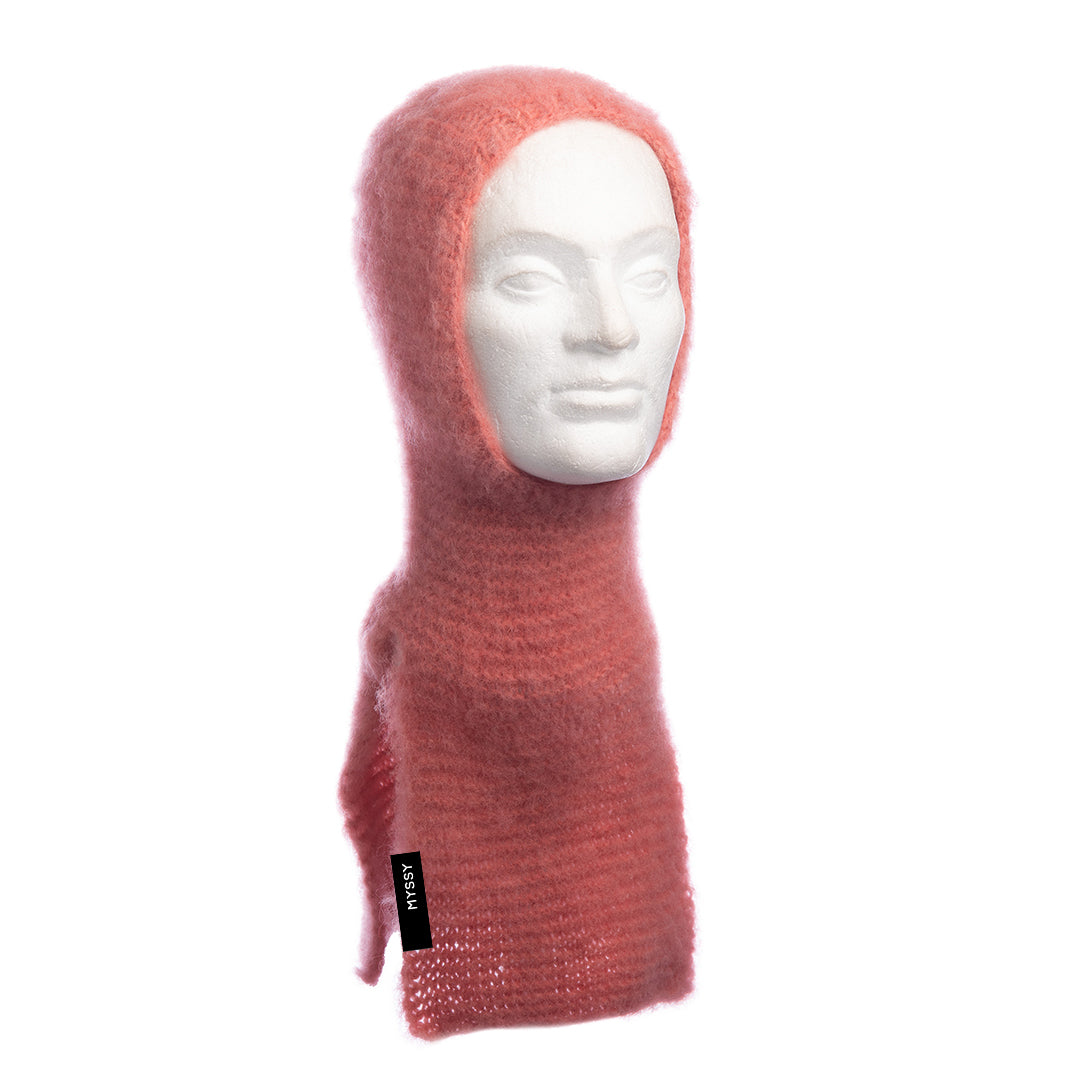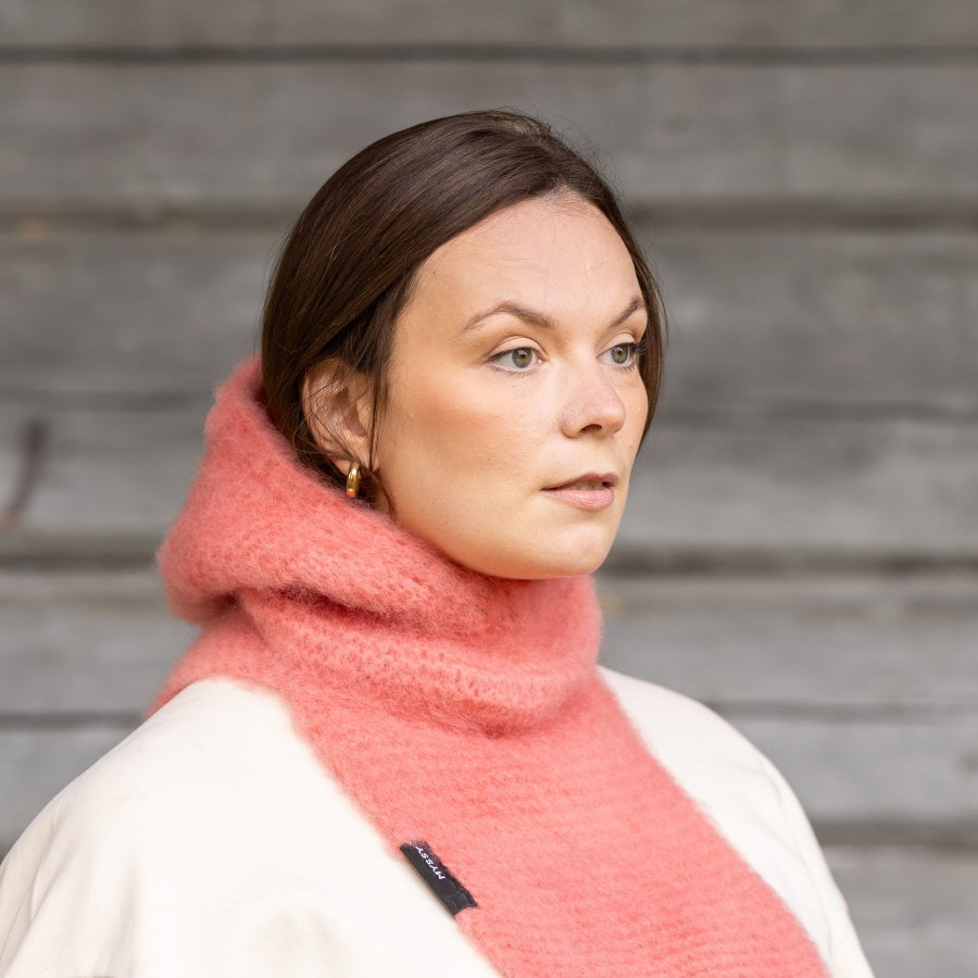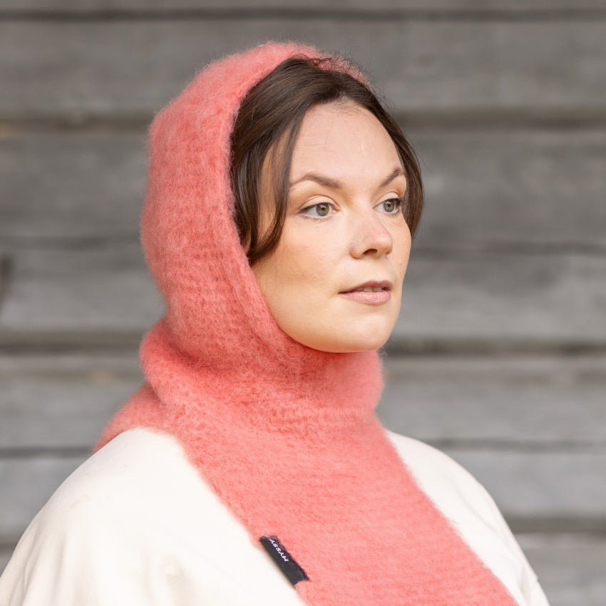 This coral pink Koralli Halla Hood is hand-knitted by Myssy Grannies in Pöytyä Finland from 100% Finnsheep wool. The yarn is natural colored. Its soft Finnsheep wool surface has been carded with traditional methods here in Pöytyä to give a special soft atmosphere and sophisticated form.