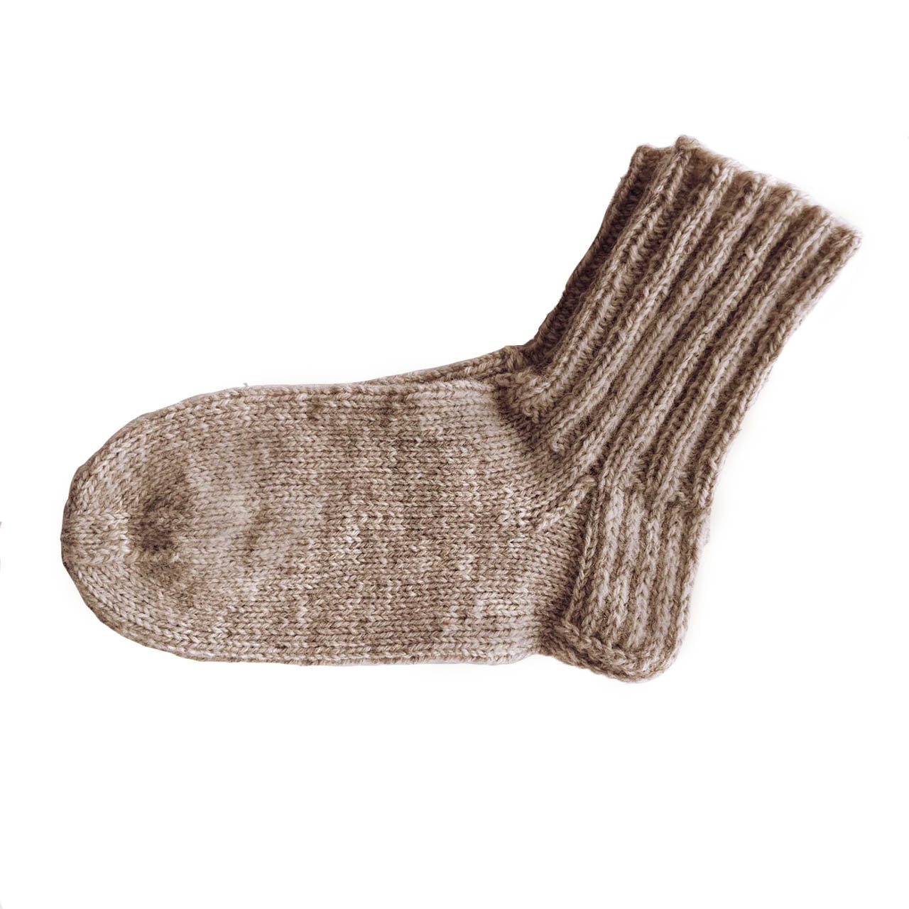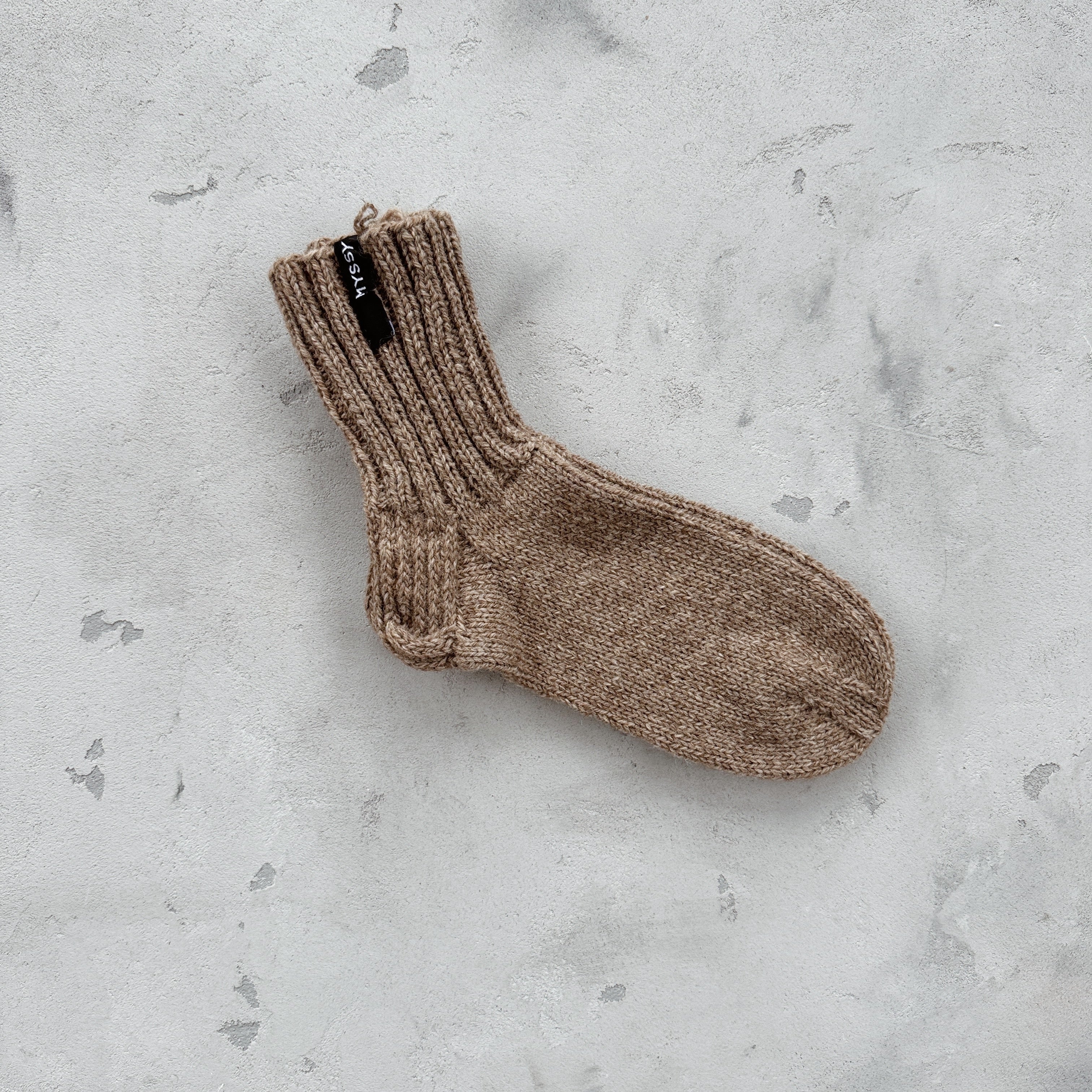 These natural light brown Hiekka Myssy Socks are hand-knitted by local Myssy Grannies using Finnish sheep wool yarn with a touch of polyamide added for durability. The color is a natural mix of different colors of wool. Due to the small batch production, there may occasionally be slight variations in the thickness of the yarn.