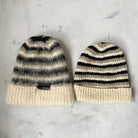 This stripy Talvi Värinä beanie has been hand-knitted and hand-carded with traditional methods here in Pöytyä to give a special soft atmosphere and sophisticated form. This beanie can be traced all the way back to the carding machine, Granny that made it, spinnery that produced the yarn and sheep farm that provided the wool. There is a natural white base with white grey and black stripes.