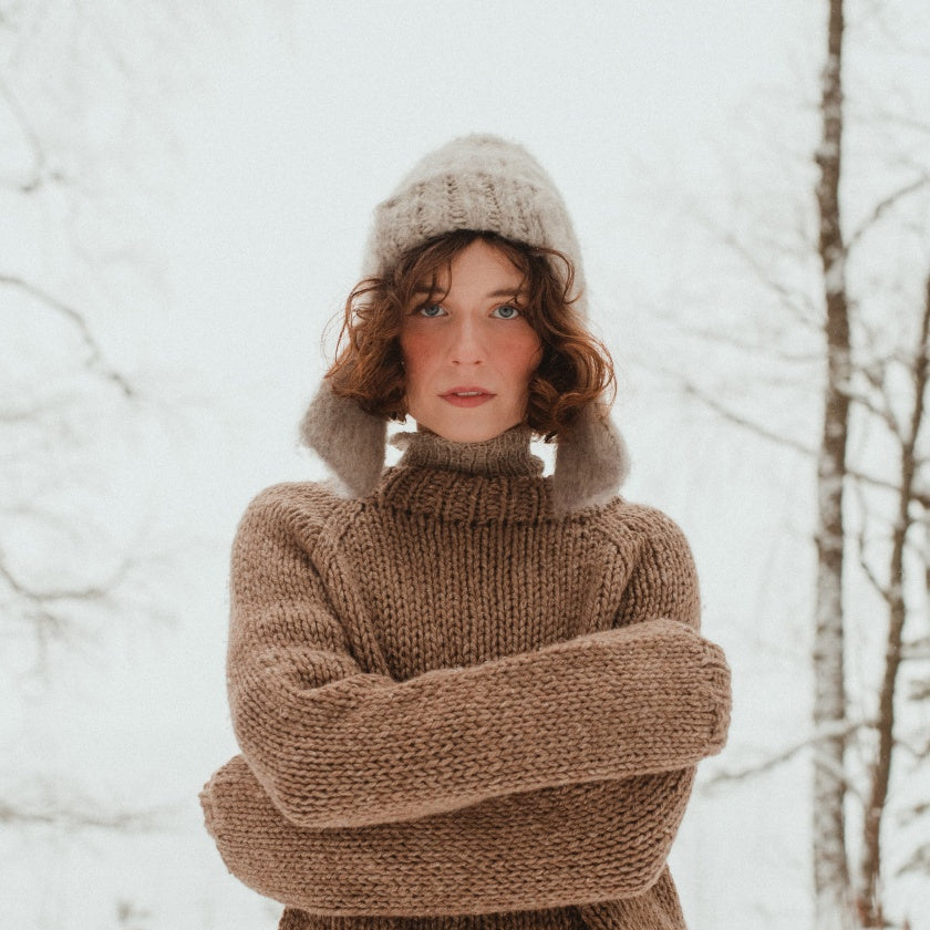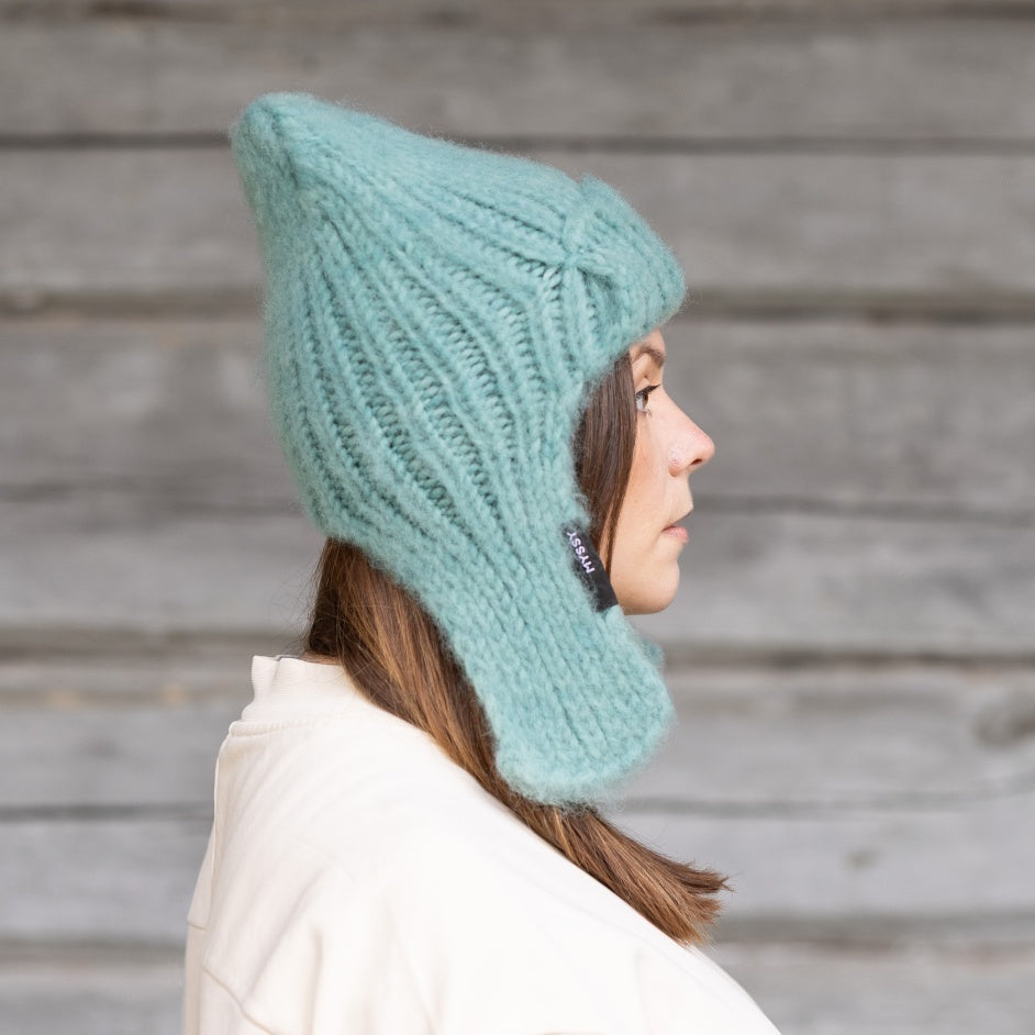 This mintgreen Minttu Lento beanie has been hand-knitted and hand-carded with traditional methods here in Pöytyä to give a special soft atmosphere and sophisticated form. This beanie can be traced all the way back to the carding machine, Granny that made it, spinnery that produced the yarn and sheep farm that provided the wool.