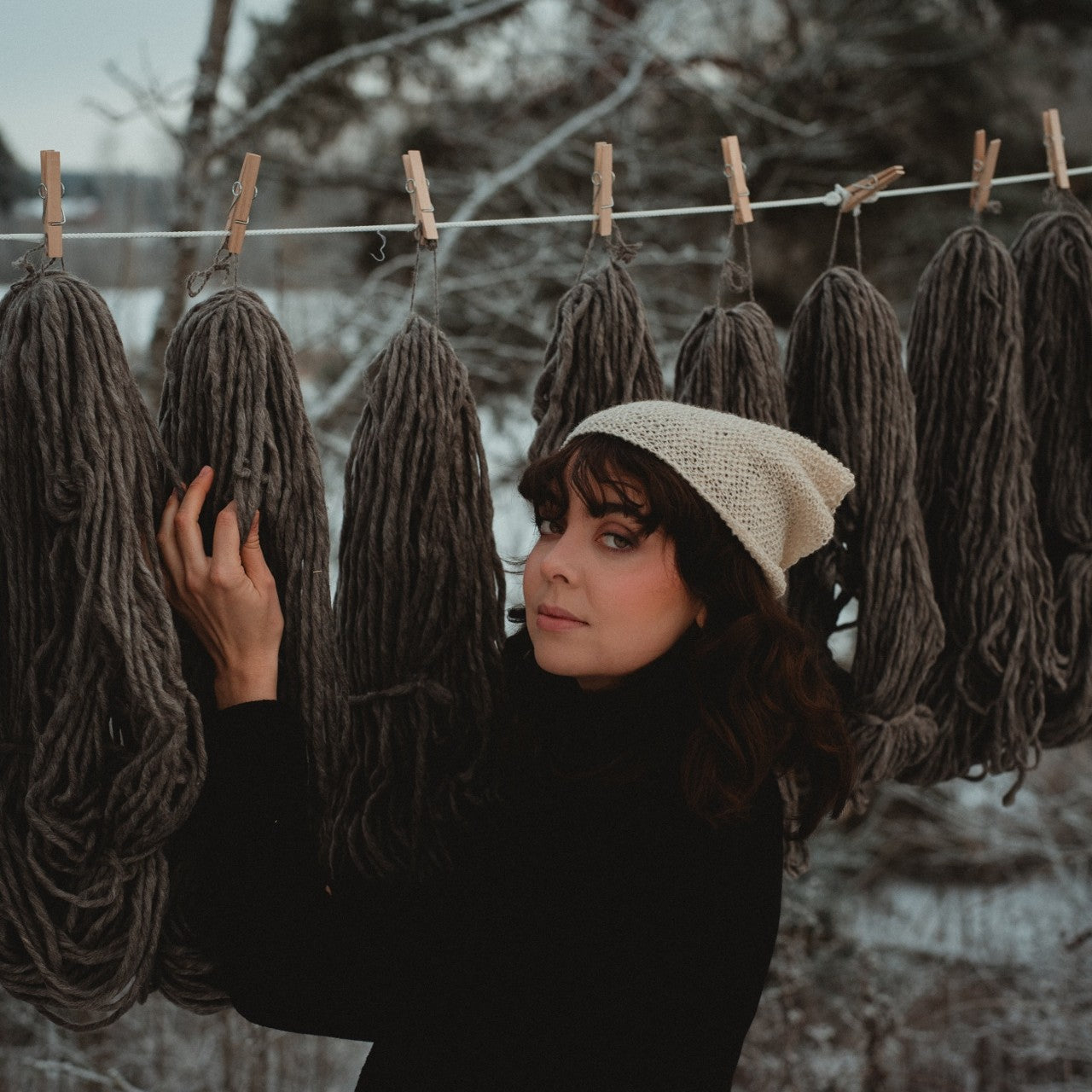 All our garments are made of 100% Finnsheep wool and dyed by hand here at our Farm. Wool is a natural material that keeps itself clean. The lanolin - wool’s grease - naturally repels both dirt and water, hence it is not necessary to wash your Myssy garments.